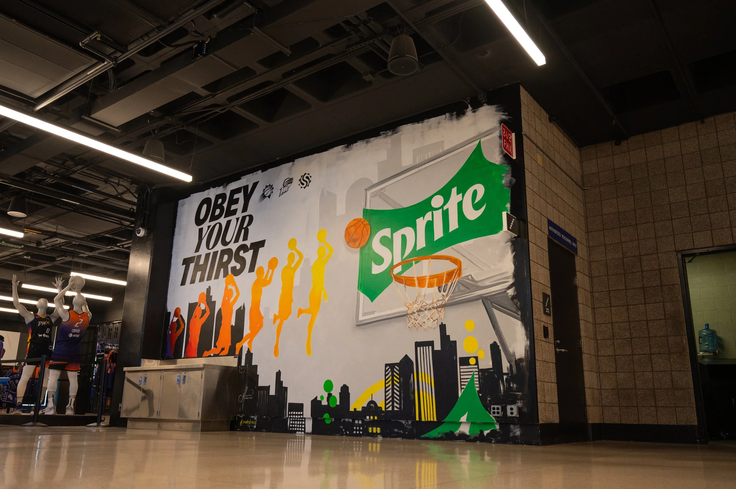 Hand painted mural for Sprite, The Phoenix Suns and The Phoenix Mercury, celebrating the joy of basketball, with downtown as the backdrop. This mural is located inside the concourse of the Mortgage Matchup Center in Downtown Phoenix, Arizona.